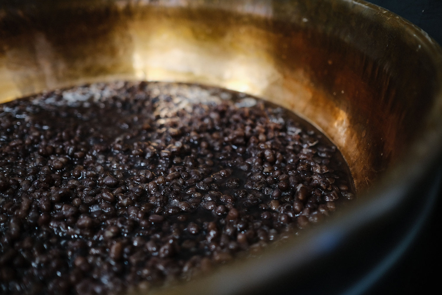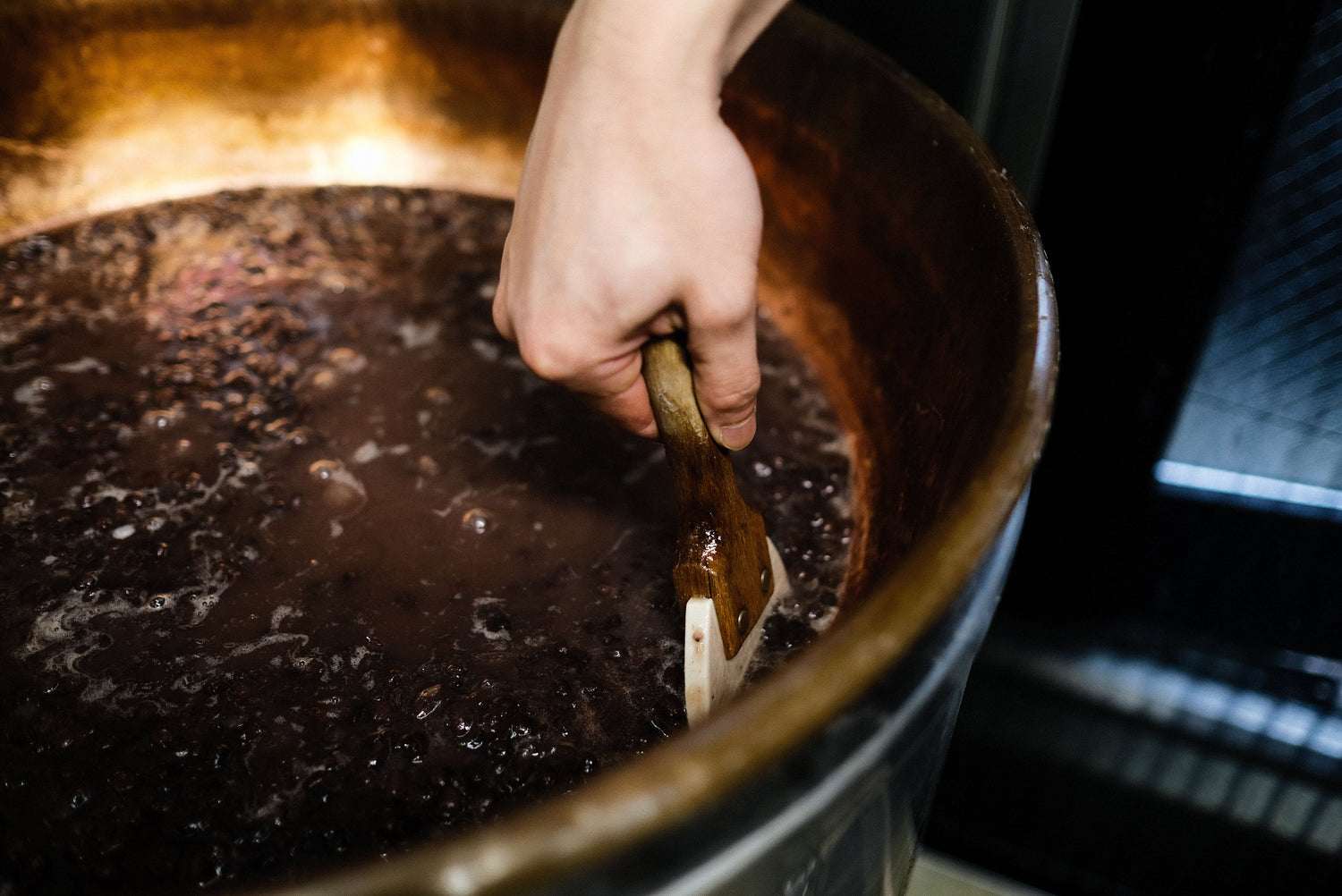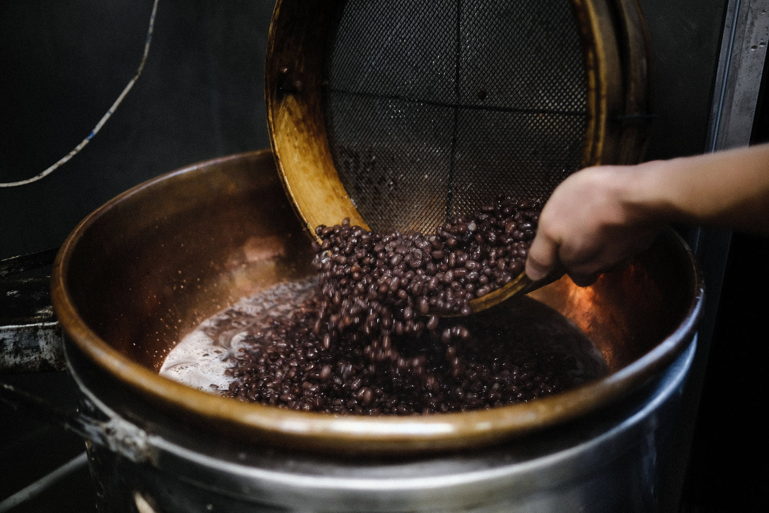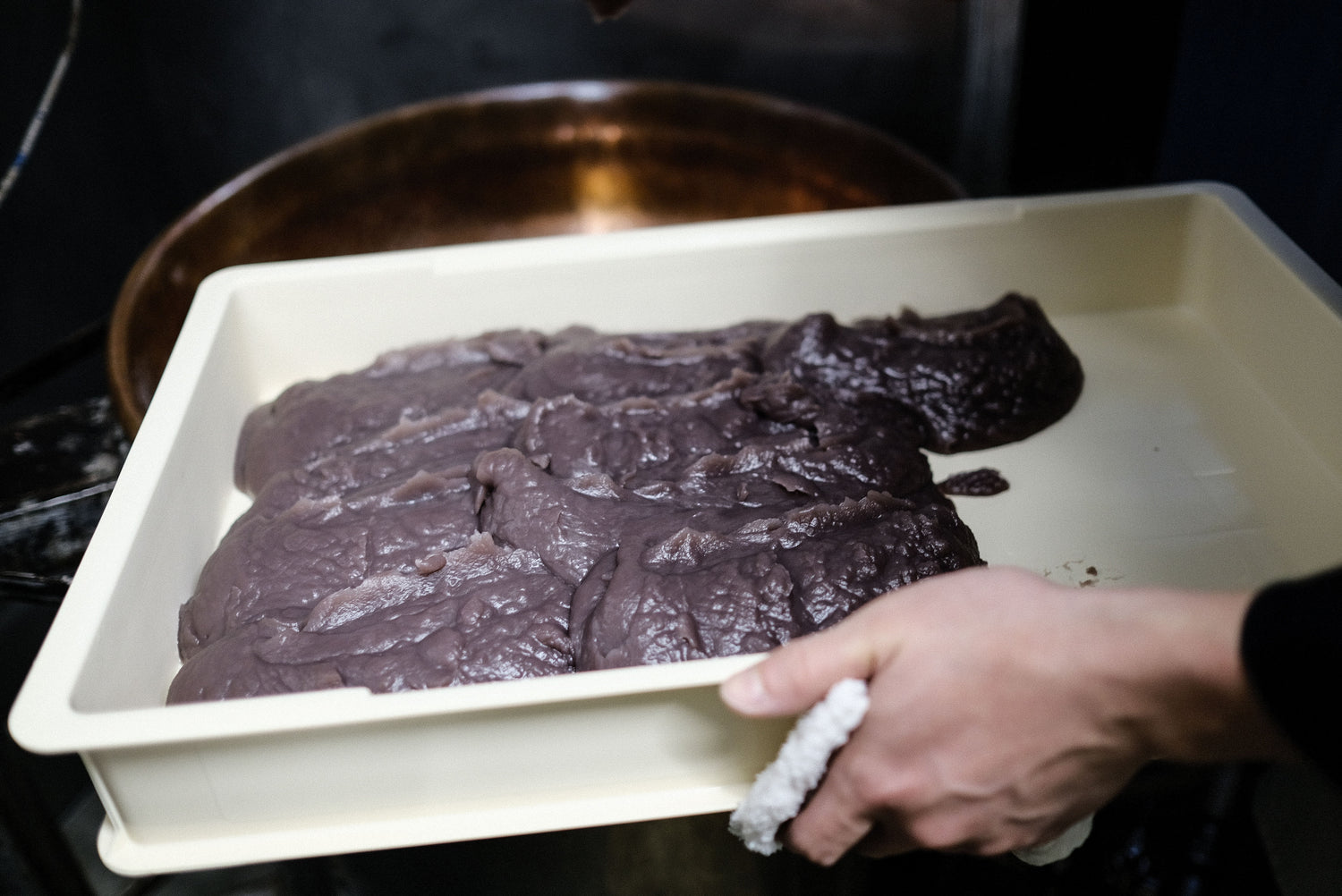 小豆の形を残しながらしっかりと焚き上げたあんこ。小豆を洗い、水の中で一日寝かし小豆にたっぷりと水分を含ませる。翌日、灰汁を取った後、圧力釜で小豆の形、風味を残しながら焚き上げる。